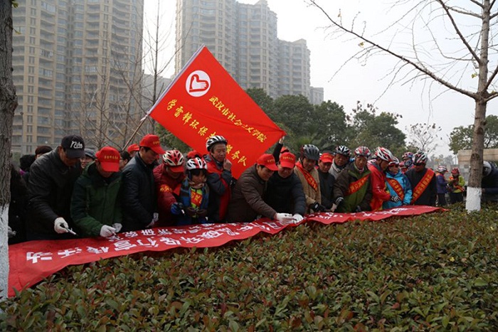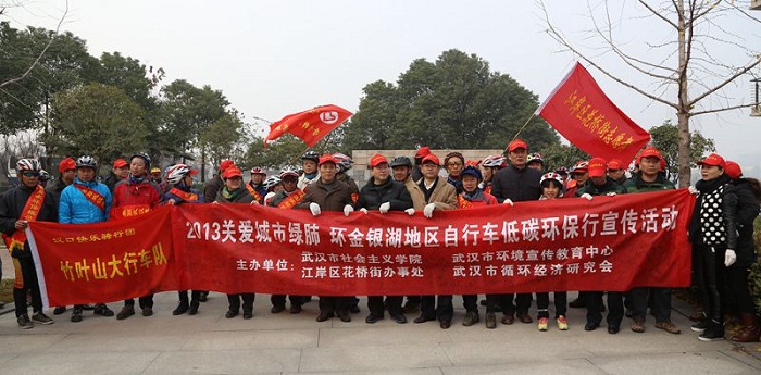 2013年12月19日,为倡导绿色出行,关爱城市绿肺,营造市民关心身边环境、自觉从自身做起、从生活做起的浓郁氛围和环境?;さ慕羝雀校晌浜菏猩缁嶂饕逖г?、江岸区花桥街办事处、武汉市环境宣传教育中心、武汉市循环经济研究会联合发起主办了“2013关爱城市绿肺-环金银湖(湿地)低碳自行车行”环保志愿者活动。