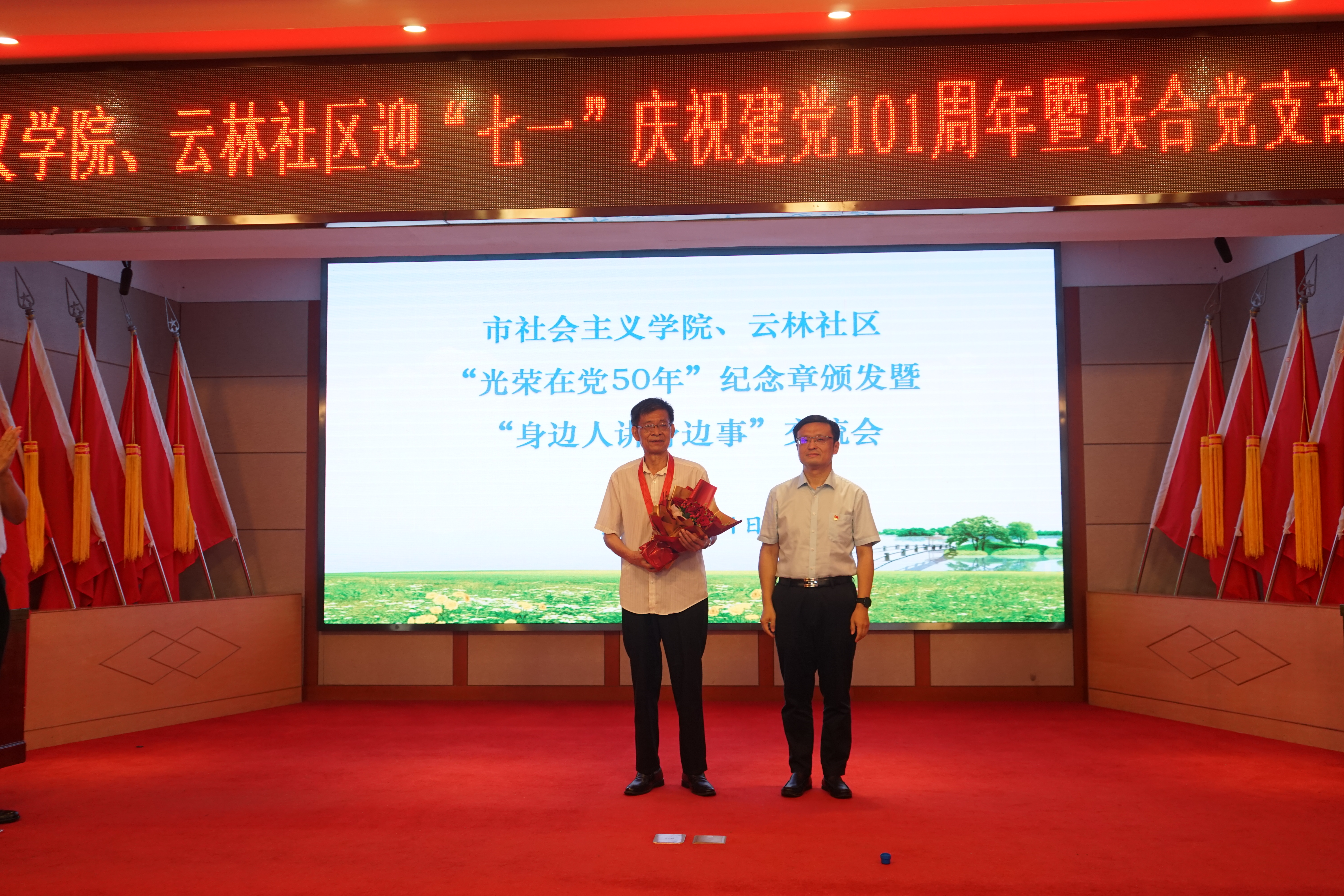 在庄严的国歌声中,面对鲜红的党旗,大家举起了右手,重温了入党誓词。随后,市委统战部副部长、市社会主义学院党组书记王磊给退休老干部何又明颁发了“光荣在党50年”纪念章并合影。何又明发表获章感言,云林社区党委副书记李琳,市社会主义学院机关党委高灯明、总务处白郧分别作“身边人讲身边事”交流发言。