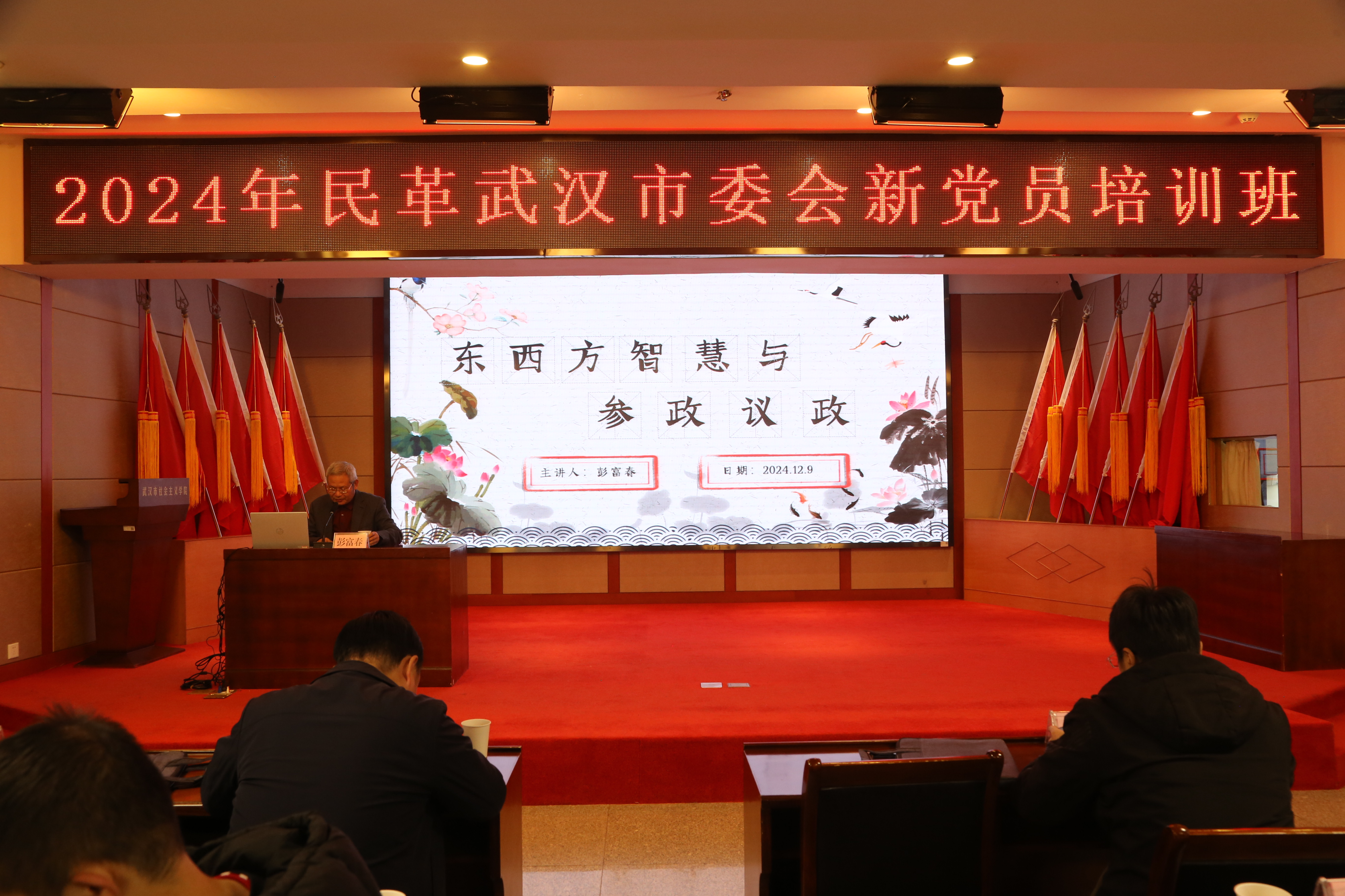 在专题讲座环节,民革武汉市委会主委彭富春以“东西方智慧与参政议政”为题亲自给学员授课,为民革新党员系好加入民革组织的第一??圩?。培训班还邀请了中共武汉市委党校明庭权教授讲授“习近平总书记关于湖北工作重要讲话和重要指示精神解读”、民革武汉市委会秘书长孙凯讲授“武汉民革简史”、武汉大学马克思主义学院卢勇教授讲授“中国新型政党制度”、市纪委监委派驻市委统战部纪检监察组办公室主任张腾讲授“纪律学习教育专题课程”、市社会主义学院教研室主任容晖讲授“武汉市社会主义学院院史”。通过系统的学习,全体学员进一步加深了对民革历史使命和时代担当的理解,夯实了思想政治基础,筑牢了思想根基,提升了思想政治素养,增强了参政议政能力。