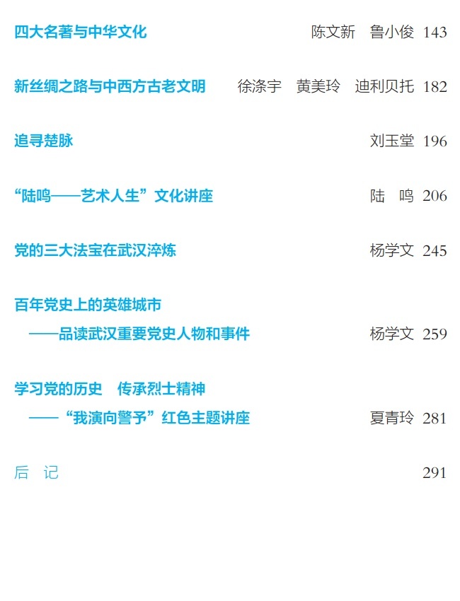 全书汇集了郭齐勇、欧阳康、彭富春、熊铁基、马敏、邱紫华、麻天祥、陈文新、江畅、刘玉堂、杨华、黄柏权、胡治洪、徐涤宇、孟华平、鲁小俊、黄美玲、迪利贝托、陆鸣、夏青玲等国内外著名专家学者和文化艺术家出席市中华文化学院近年来电视嘉宾中华文化论坛高端对话和辅导报告会成果。其中,共有4位“马克思主义理论研究和建设工程首席专家”、13位二级教授,2位“长江学者”特聘教授、1位百家讲坛”学者,2位一级演员、戏剧“梅花奖”获得者出席参与市中华文化学院中华文化交流活动。