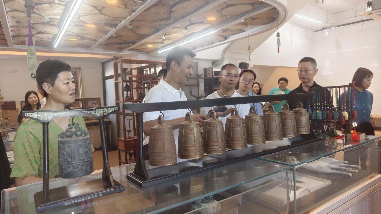在传统青铜打击乐器铸造技艺工作室,非遗传承人陈世辉介绍了融合传统失蜡法、手工调音、乐器制作技艺及多学科工艺的应用复刻编钟的过程。九三学社社员、湖北省歌剧舞剧院交响乐团小提琴独奏朱莹跨界体验打击乐器编钟,现场敲奏了一首耳熟能详的《茉莉花》,大家不由得感慨,把一个个大小不同的编钟,做成音色清脆、音高精准、音域完整的编钟套组,其铸造打磨工艺要求之高、难度之大,令人叹为观止。