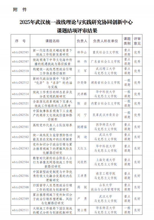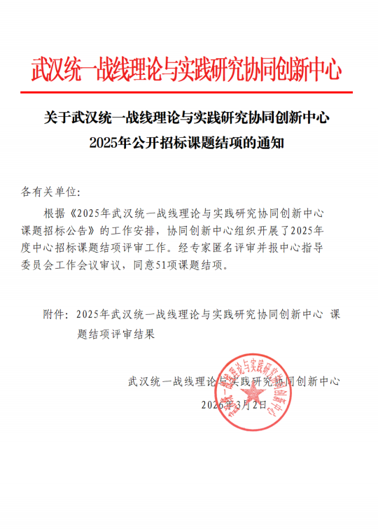 关于武汉统一战线理论与实践研究协同创新中心2025年公开招标课题结项的通知