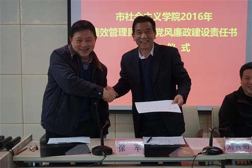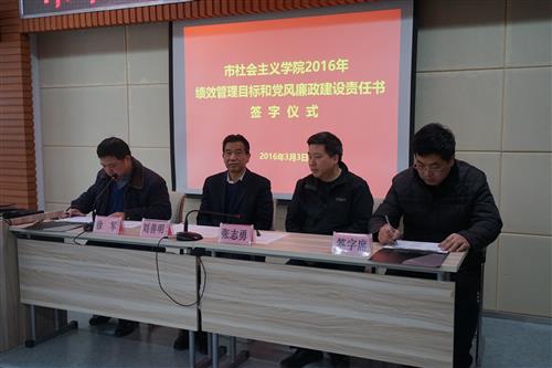 3月3日,市社会主义学院举行2016年度绩效管理目标和党风廉政建设责任书签字仪式。院党组书记刘善明和分管院领导、各处室负责人分别签订了绩效管理目标责任书和党风廉政建设责任书。